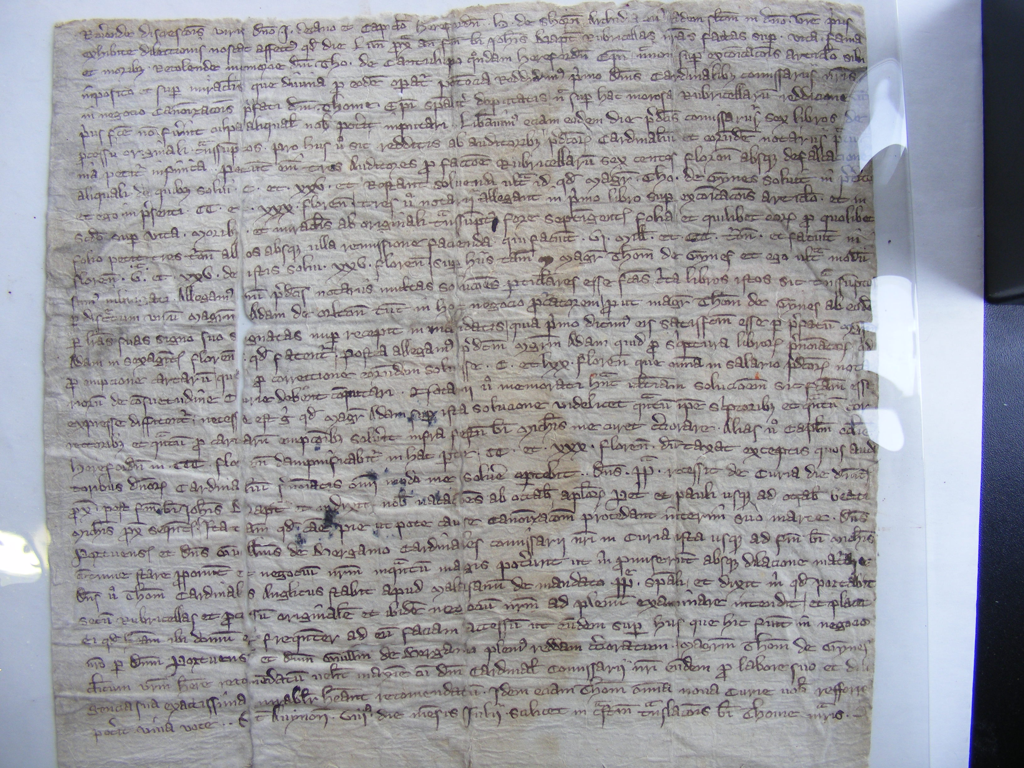 The letter begins with Henry de Shorne’s apology for the delay in St Thomas de Cantilupe’s canonisation proceedings, but then goes on to assure the recipient John, dean of Hereford, that the six volumes of evidence copied from the original interview proceedings are to be sent directly so that work can resume on the case: six volumes!