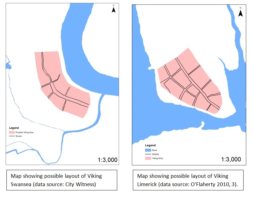 From examining the layouts of Viking towns in Ireland they seem to have consisted of one or two main streets, parallel to the shore or a riverbank, with lanes running back from it at right angles. The streets tend to follow the natural contours of the locations chosen. This is also the case in Swansea, where the suggested Viking area of the town consists of one main street running parallel to the river with lanes running back at right angles. Its layout does not look out of place among the Hiberno-Norse towns; in fact it appears very similar to the plan of Viking Limerick, as can be seen here.