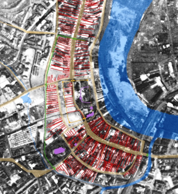 A process of selective digitisation of urban features from the digital map-image (‘raster’) produces digital map data (‘vectors’), and in the GIS – which is essentially a spatial database – these vectors are grouped as ‘layers’, one each created for the digitised streets and plots. Of course, at this initial stage in the mapping process, the digitised streets and plots in the GIS reflect the situation in the nineteenth century, at the time of the 1852 survey. Since the aim of using the plan-analysis is to show the town’s medieval layout only those areas known from documentary and archaeological sources to have been built up at that time had streets and plots digitised.