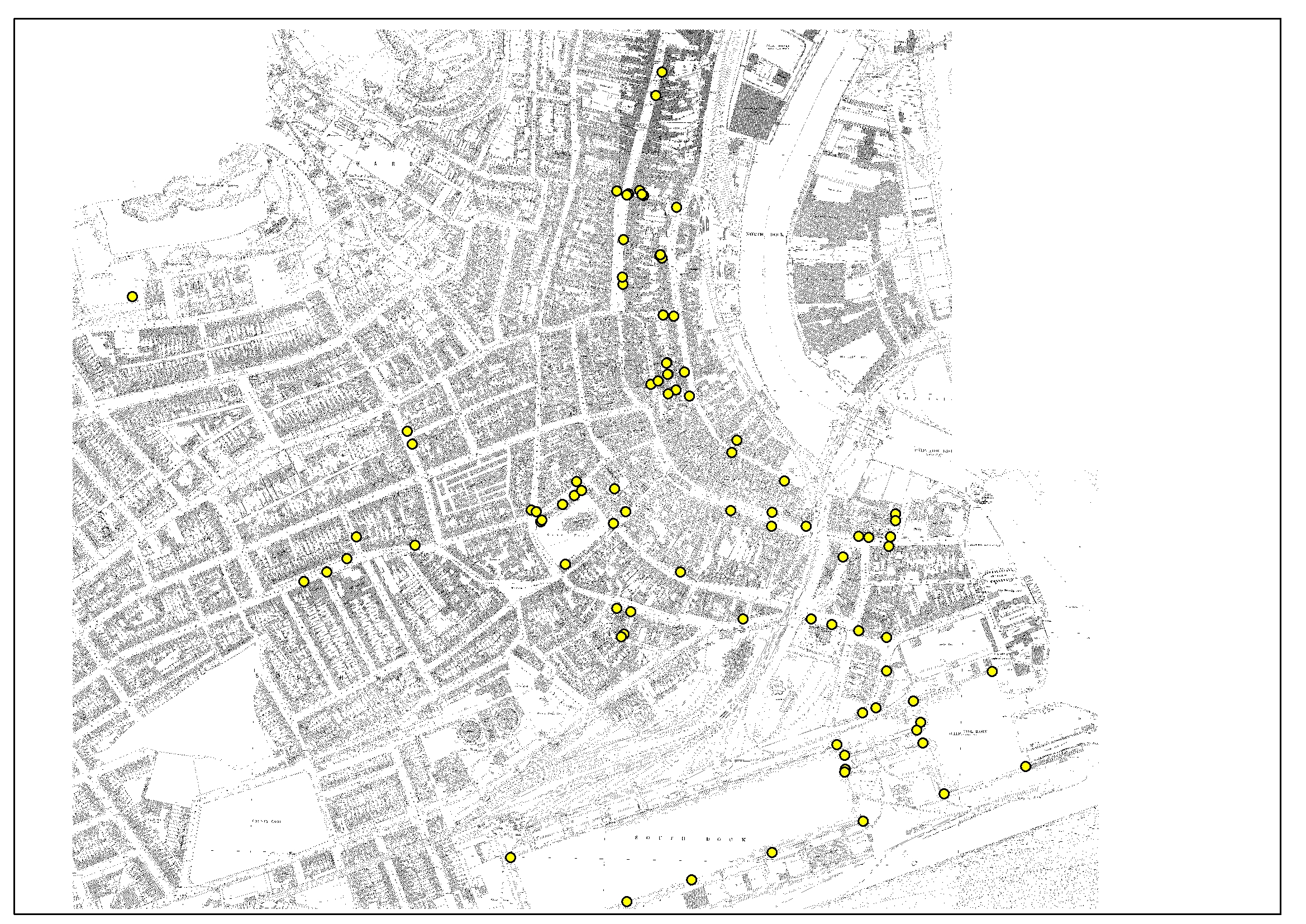 Following on from this, the georectified maps, especially the Board of Health plans, Swansea’s streets and plots were selectively digitized in the GIS at Queen’s University Belfast. In completing this digitising work, previous research on the layout of medieval Swansea provided a useful guide to identify the maximum spatial extent of the town during the Middle Ages.